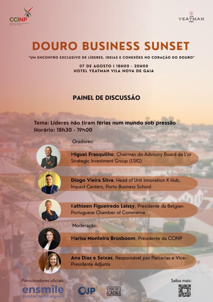 A Câmara de Comércio e Indústria dos Países Baixos - Portugal (CCINP) organiza no dia 7 de agosto, das 18h00 às 20h00, o Douro Business Sunset, um encontro exclusivo de alto nível entre líderes empresariais e institucionais, no The Yeatman Hotel, em Vila Nova de Gaia. O evento atingiu rapidamente a lotação máxima, refletindo o dinamismo da comunidade empresarial lusófona.