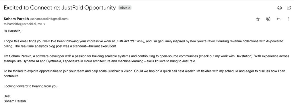 Email partilhado na plataforma X por Harshith Vaddiparthy sobre uma alegada candidatura espontânea de emprego de Parekh. Vaddiparthy, sublinha que não chegou a a contratá-lo porque os tempos de resposta aos emails eram “demasiado longos”.