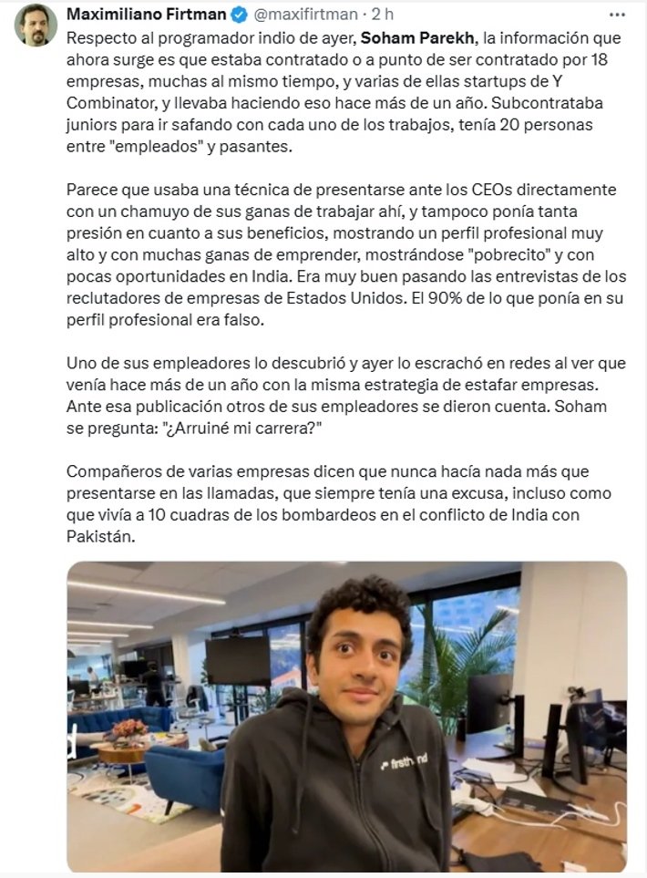 Soham Parekh é um engenheiro de software indiano, licenciado pela University of Mumbai e mestre em Ciência da Computação pela Georgia Tech (EUA). Com um perfil técnico altamente qualificado, foi contratado remotamente por várias startups emergentes, incluindo empresas ligadas à Y Combinator e ao sector da inteligência artificial, como Dynamo AI, Synthesia, Alan AI, entre outras.