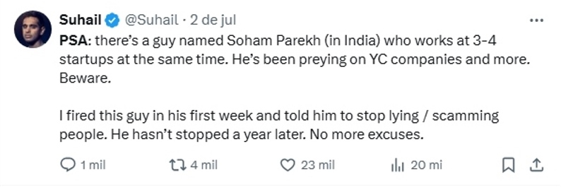 Contudo, segundo diversos fundadores, Parekh terá aceite simultaneamente várias propostas de trabalho, sem informar qualquer uma das empresas sobre os seus compromissos paralelos. A denúncia inicial surgiu a 2 de julho, quando Suhail Doshi, fundador da Mixpanel e da Playground AI, publicou na rede X um alerta às empresas da Y Combinator: