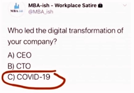 De facto, a resposta correta é a aliena c). Não foi o líder da empresa, nem o responsável da transformação digital, foi mesmo o Covid-19 que decidiu o momento da mudança organizacional.