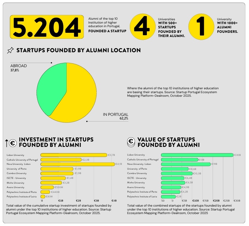 O relatório, elaborado com base nos dados da plataforma Dealroom.co e no mapeamento do ecossistema da Startup Portugal, identificou mais de 5.200 alumni das dez principais instituições de ensino superior como fundadores de startups, das quais 62,2% foram criadas em Portugal. “O ecossistema académico nacional está cada vez mais orientado para a inovação, com uma cultura que estimula a iniciativa, a criatividade e o impacto social e económico”, acrescentou Miguel Aguiar.